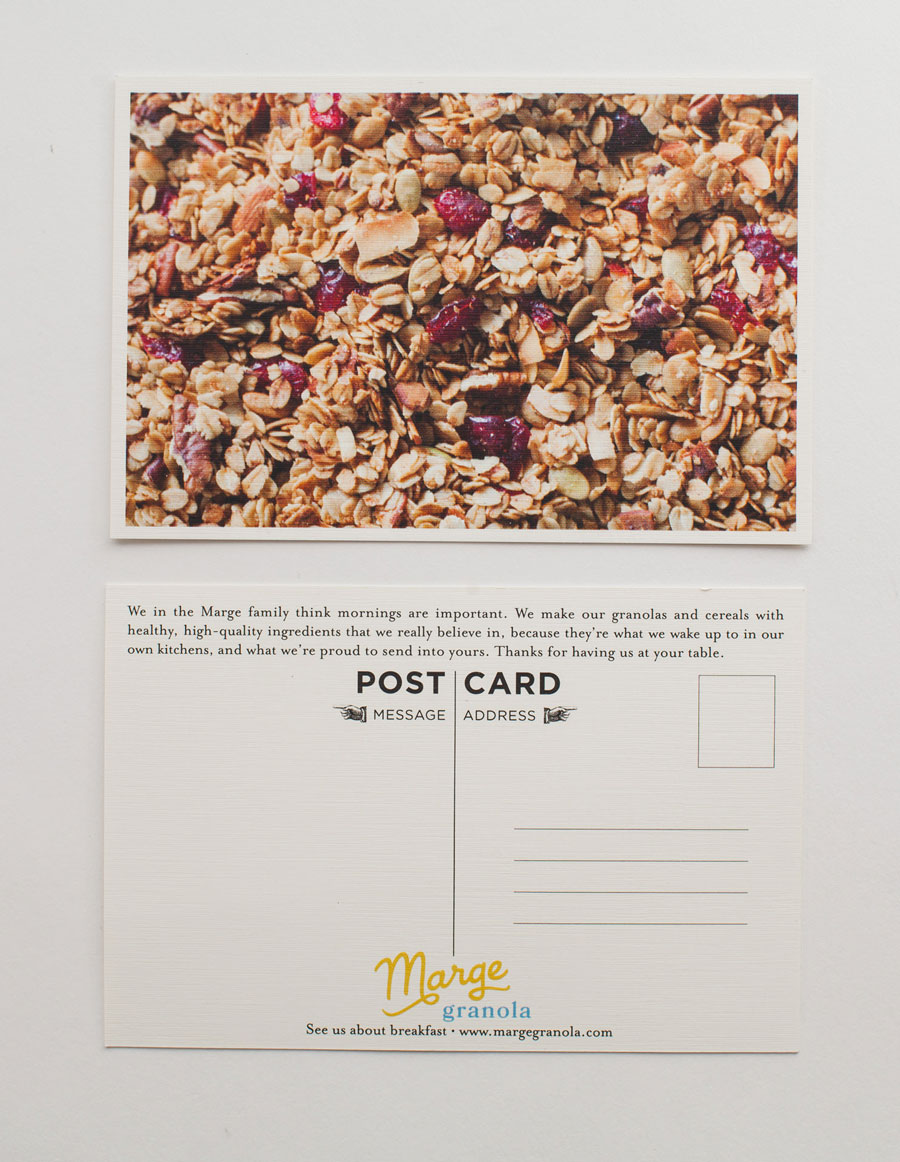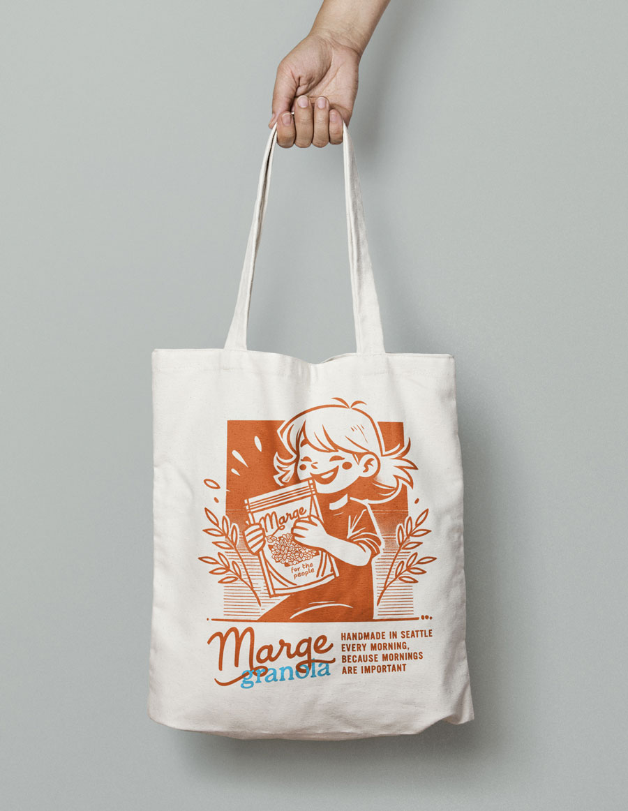 The Marge Granola logo was drawn entirely by hand to emphasize the crafted, human touch behind the product’s origin story—a nod to the founder’s heritage and a visual foundation for the brand’s warmth and sincerity.